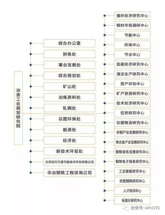 近年来伴随钢铁行业进入发展新常态,冶金规划院特别开展了绿色发展规划、企业环保诊断、“一带一路”和钢铁企业“走出去”规划研究、产品深加工规划研究、多元产业发展规划、企业降本增效规划研究、物流优化、管理提升、两化融合、智能制造和电子商务发展研究、体制机制改革、人力资源优化等新的业务领域,协助众多钢铁企业完成自身的转型升级,实现整体竞争力的提升。 冶金规划院组织机构