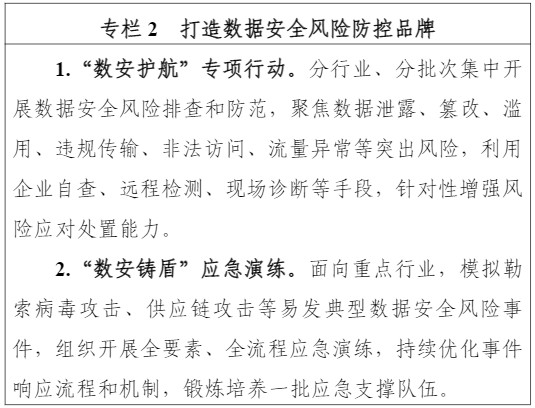 6.加强数据安全风险防控。完善工业领域数据安全风险信息报送与共享工作机制,组建数据安全风险分析专家组,动态管理风险直报单位库,协同加强地方力量,常态化开展风险监测、报送、预警、处置等工作。摸排数据安全风险事件特点和规律,建立重大风险事件案例库,加强案例剖析和风险提示。面向重点行业开展“数安护航”专项行动,定期组织“数安铸盾”应急演练,提升事件快速反应、规范处置、协同联动水平。