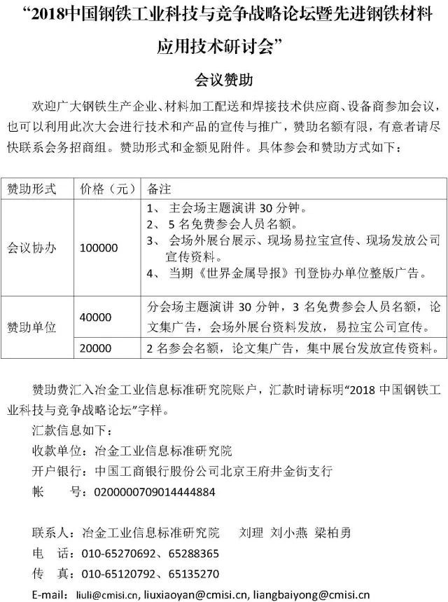 参会代表可提前注册,将会议费汇入冶金工业信息标准研究院账户,汇款时请标明“2018中国钢铁工业科技与竞争战略”字样。