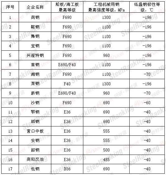 性能等级指企业能够提供产品的极限性能级别水平,如船板/海工板的最高性能等级、工程机械用钢的最高强度级别、低温钢最高韧性等级等指标。