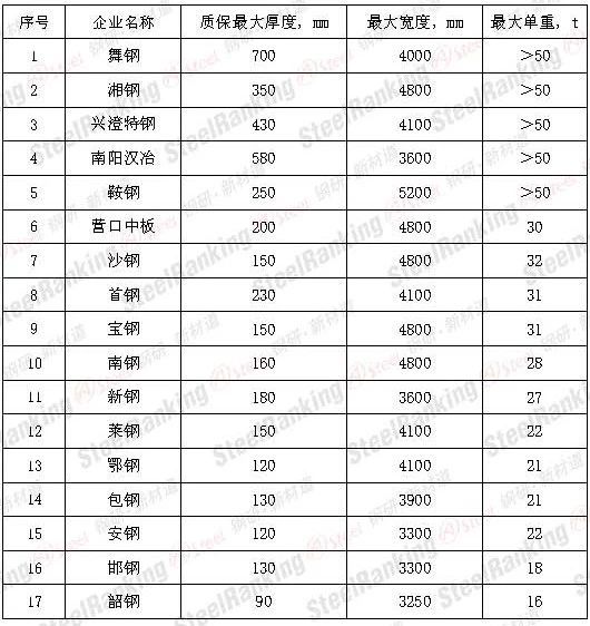 如首钢和新钢具有400mm以上连铸坯,其钢板的最大质保厚度略高,首钢为230mm,新钢为180mm。南钢连铸坯最大厚度为320mm,可供应的产品最大质保厚度为160mm,最大单重为28t左右。