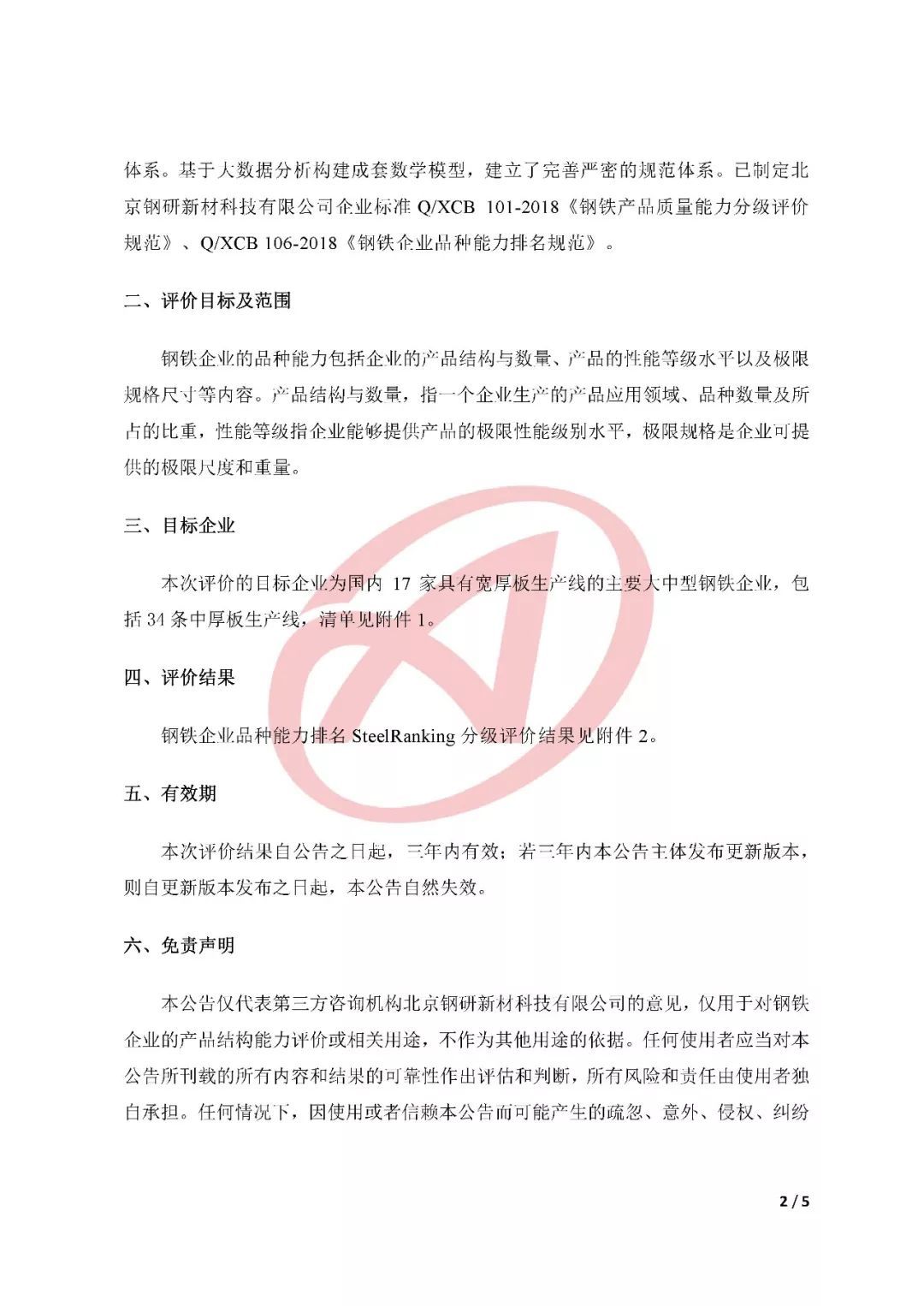 本次评价的目标企业为国内17家具有宽厚板生产线的主要大中型钢铁企业,包括了34条中厚板生产线。仅拥有普通中板轧机的企业不在本次排行榜范围内。本次排行榜采用品种数量、极限规格和性能等级三大指标、数十个指标参量,基于大数据分析构建成套数学模型,综合分析量化评价而获得。