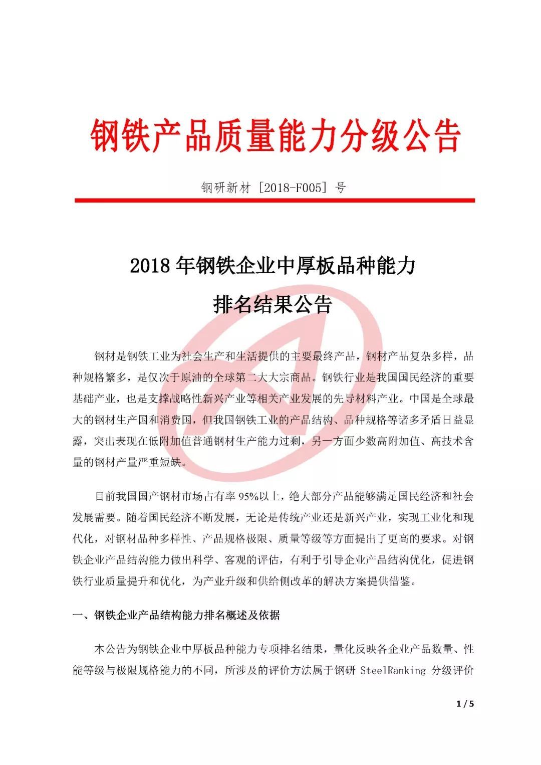 2018年钢铁企业中厚板品种能力排行榜新鲜出炉